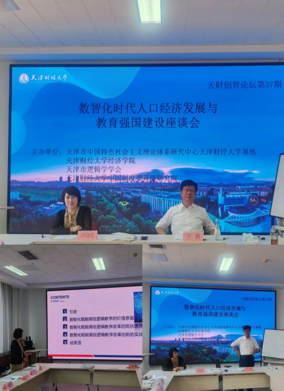 为深入贯彻落实党的二十大和二十届二中、三中全会精神,学习贯彻习近平经济思想、习近平总书记关于教育的重要论述、全国教育大会精神和学校第三次党代会精神,2025年7月4日下午,由天津市中国特色社会主义理论体系研究中心天津财经大学基地、天津财经大学经济学院、天津市逻辑学学会、中国制度型开放研究院联合主办的“数智化时代人口经济发展与教育强国建设座谈会”在天津财经大学经济学院会议室顺利举行。会议邀请到北京大学信息技术高等研究院高级研究员、南京大学哲学院顾问教授、南开大学马克思主义社会学研究中心特聘教授王勇和天津师范大学马克思主义学院教授周晓桂分别做主题报告。经济学院党委书记韩廷波、院长齐俊妍、天津市逻辑学学会会长刘明明、天津市中国特色社会主义理论体系研究中心天津财经大学基地的研究员及马克思主义学院等兄弟学院教师参会。
