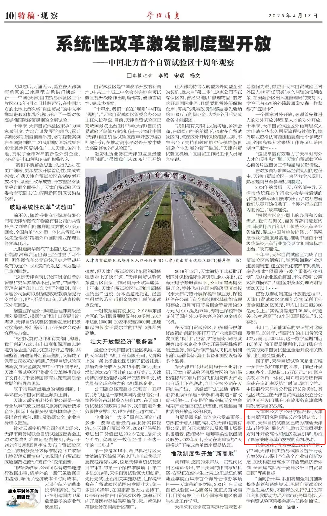 天津财经大学经济学院院长、天津市自贸区研究院副院长齐俊妍认为,十年来,天津自贸试验区已成为推动天津城市转型的“催化剂”,助力天津重塑北方对外开放高地和经济发展引擎,形成了国家战略与城市发展的有机联动。